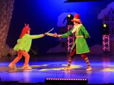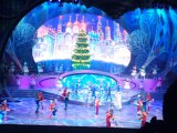 Детям был организован показ спектакля-мюзикла «Новогодние сны Оле Лукойе». После завершения спектакля, веселые персонажи Ириска и Карамелька пригласили детей к зеленой красавице в мраморный зал, где их встречали главные герои праздника Дед Мороз и Снегурочка.