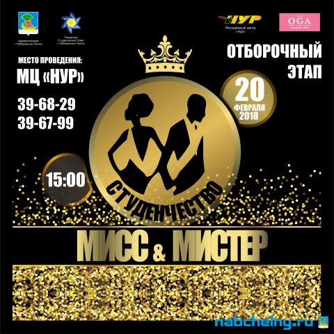 20 февраля в Набережных Челнах пройдет отборочный тур городского студенческого конкурса красоты и таланта «Мисс и Мистер студенчество – 2018». Конкурс создан для выявления талантливых студентов, в которых внешняя привлекательность сочетается с творческими способностями, успешной учебой, а также принимающих активное участие в студенческой общественной деятельности.