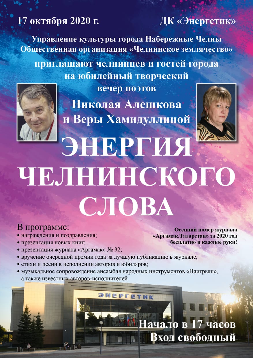 17 октября в 17:00 в ДК «Энергетик» состоится юбилейный вечер челнинских поэтов Николая Алешкова и Веры Хамидуллиной, творчество и литературные заслуги которых известны далеко за пределами города и Республики Татарстан.