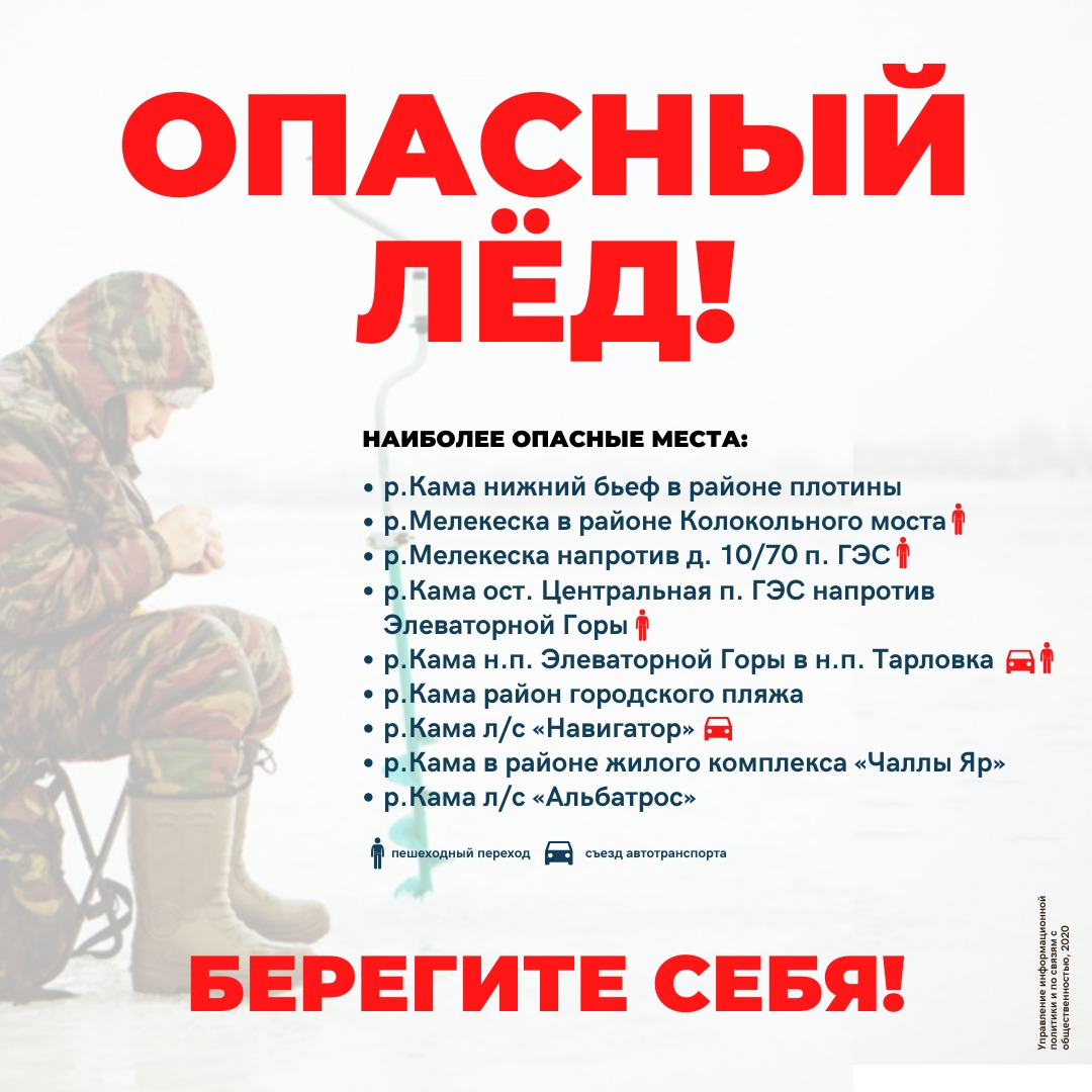 В связи с приближением холодов и периода ледостава водные объекты представляют повышенную опасность для жизни и здоровья людей. На территории Набережных Челнов имеются места массового выхода людей и выезда автотранспорта на лед, которые являются местами особого риска.