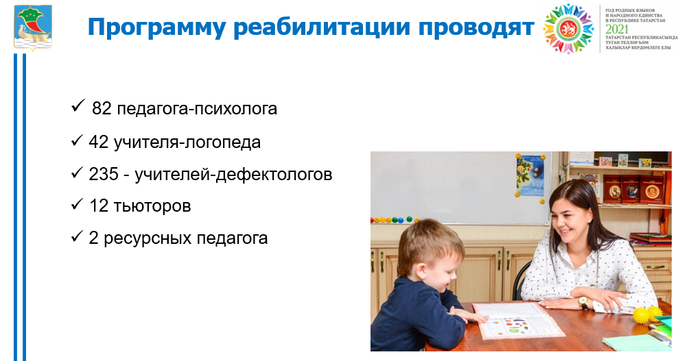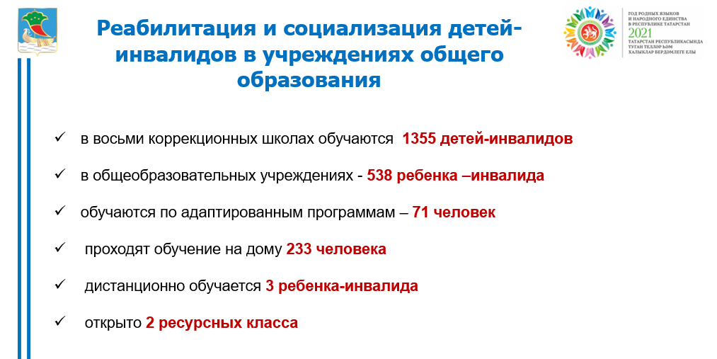 На базе Центра №85 с сентября месяца получают психолого-педагогическую помощь3 ребенка-инвалида в возрасте от 0 до 3 летпо пилотной программе оказания ранней помощи в Республике Татарстан. В настоящее время в городе функционирует сеть учреждений общего образования, вся деятельность которых направлена на социально-психологическую, индивидуальную реабилитацию детей, интеграцию их в обществе. Охват обучением детей-инвалидов школьным обучением составляет 100%.