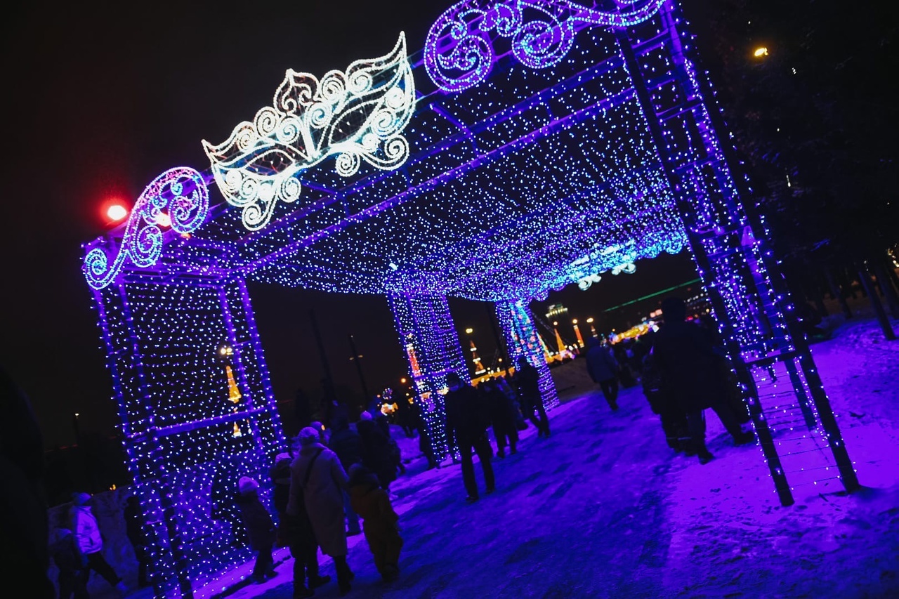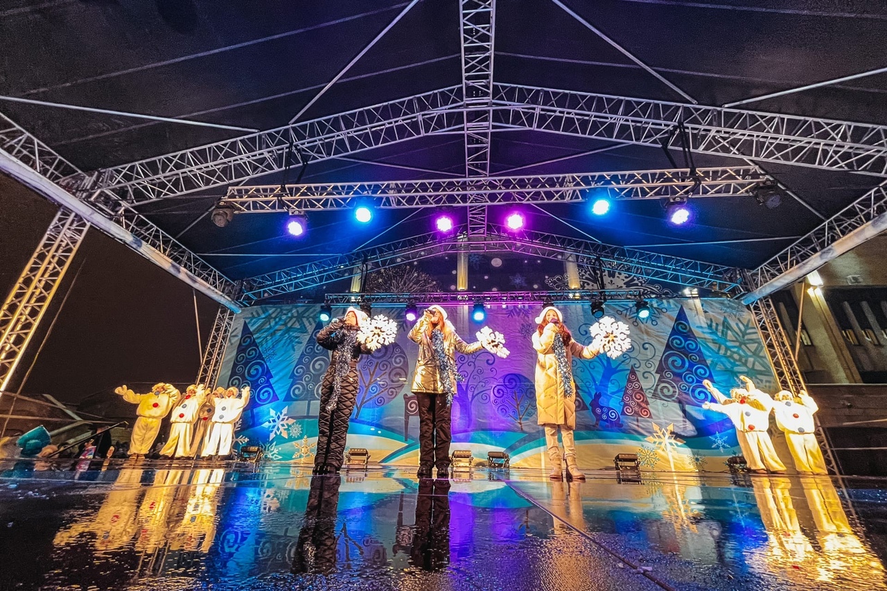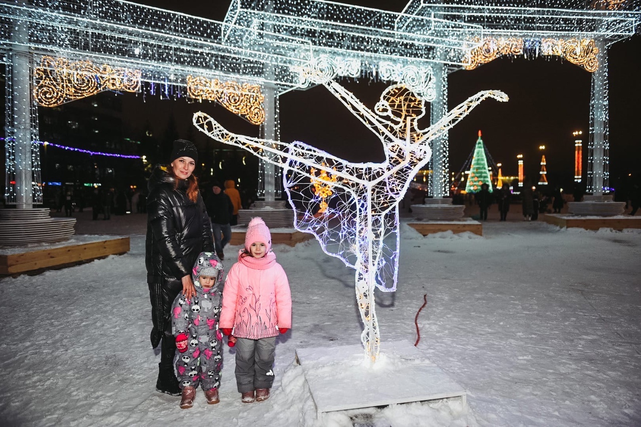 Вся площадь засияла огнями, музыкой. Подсветка в виде конфет и хлопушек появилась на столбах освещения, на деревьях раскинулись цветные огни.