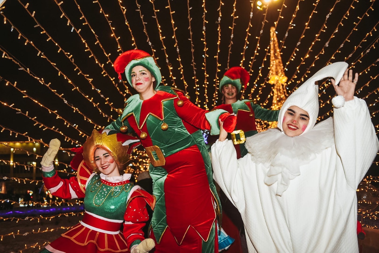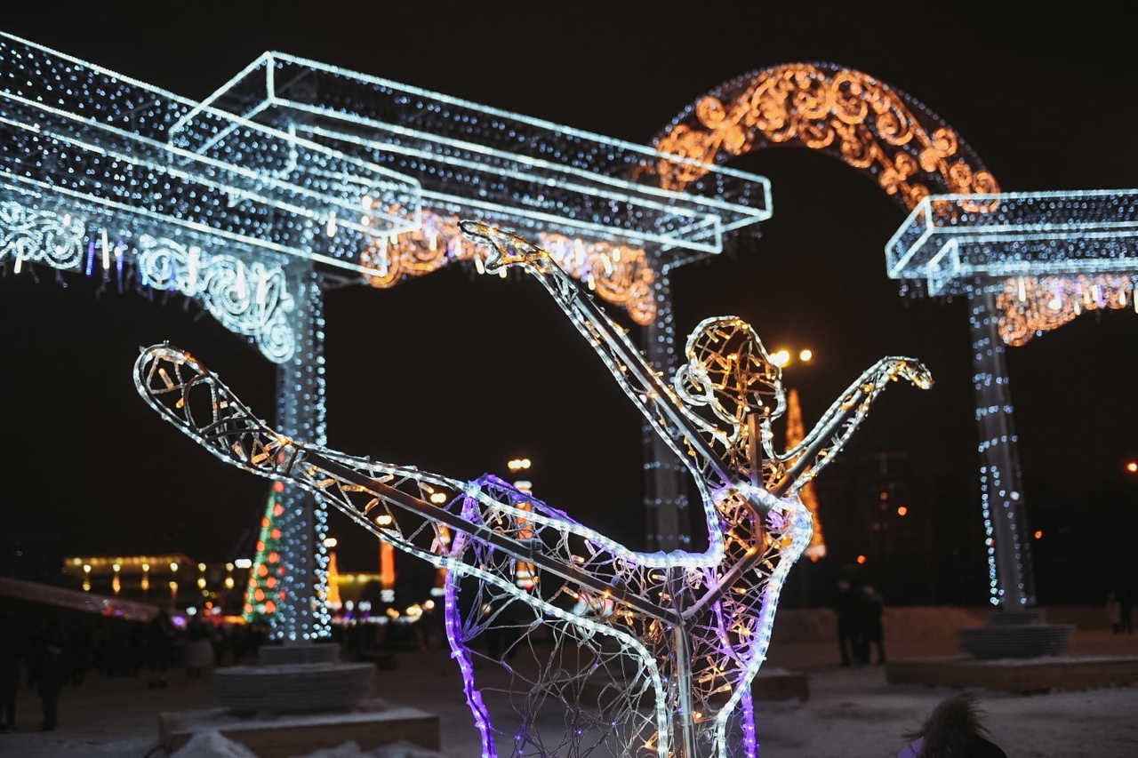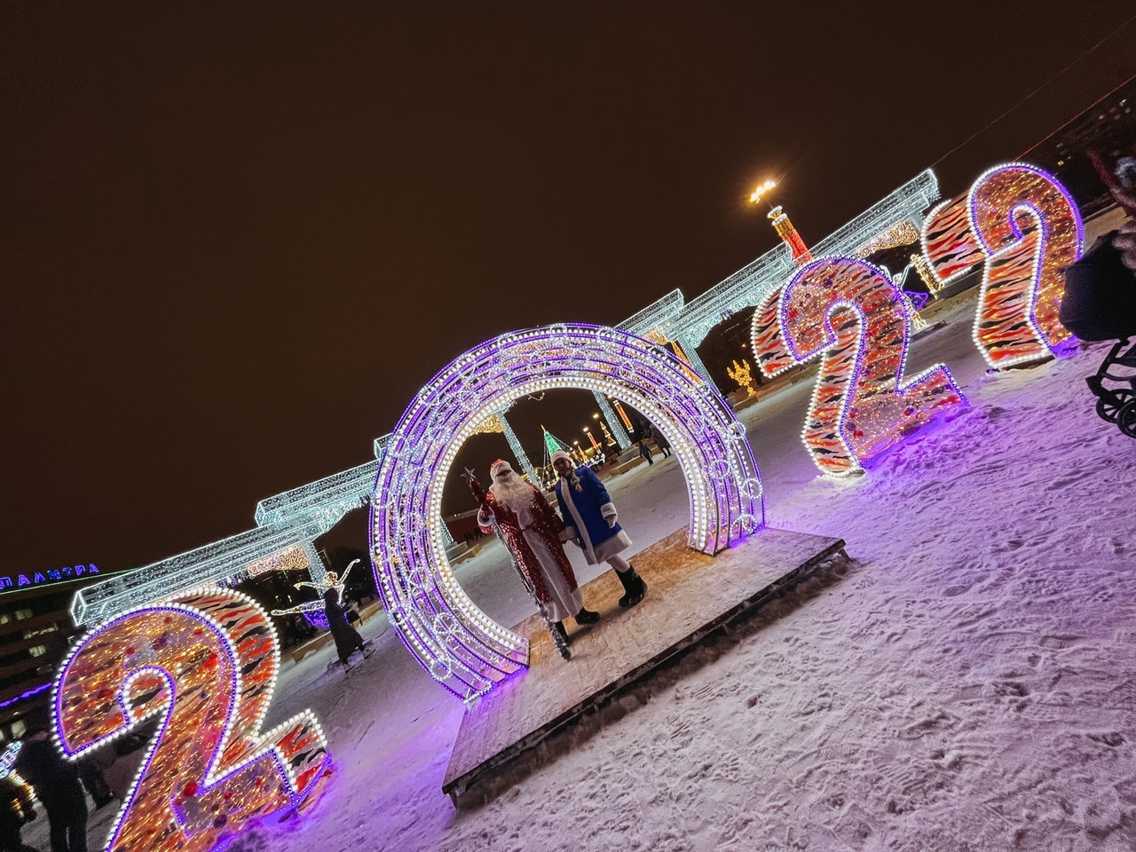 Вся площадь засияла огнями, музыкой. Подсветка в виде конфет и хлопушек появилась на столбах освещения, на деревьях раскинулись цветные огни.