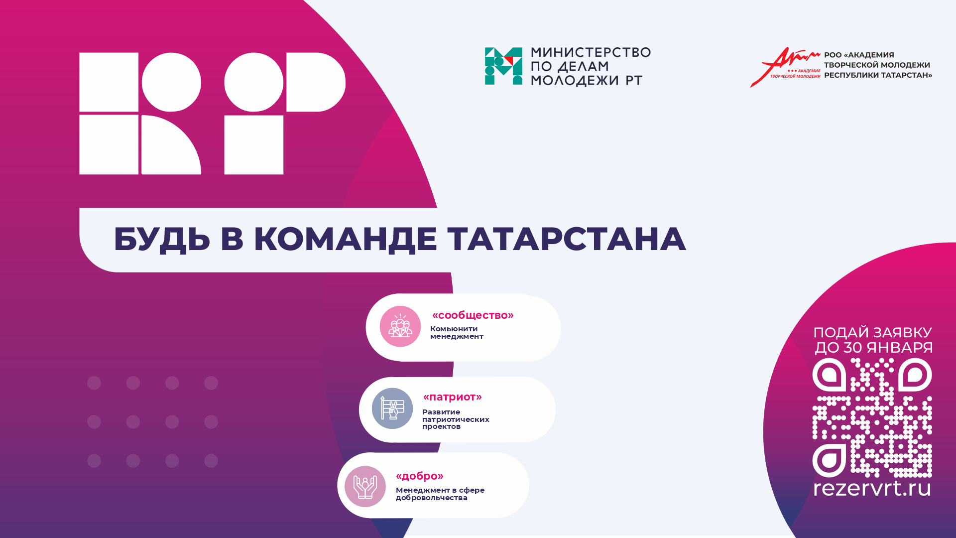 С 14 декабря 2021 года по 30 января 2022 года открыта регистрация для участия в республиканском проекте «Кадровый резерв. Команда республики». Задачей является формирование и развитие кадров для реализации государственной молодежной политики в Республике Татарстан.