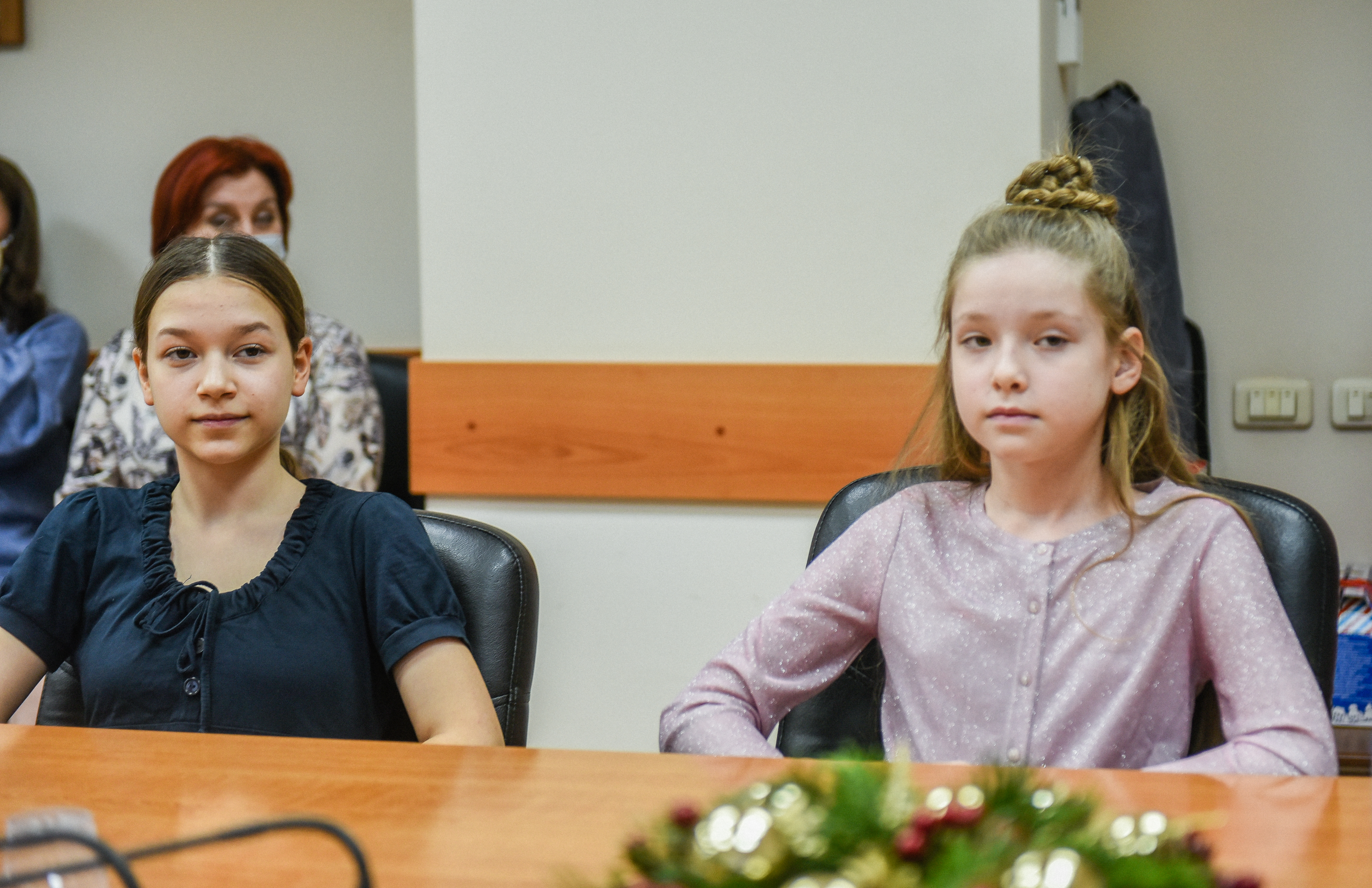 Мэр города Наиль Магдеев встретился с юными челнинцами, чтобы поздравить их с наступающим Новым годом и вручить подарки. В зале находились четверо детей - это Камиль Петров, Алмаз Латипов, Василя Ханифуллина, Арина Мансурова.