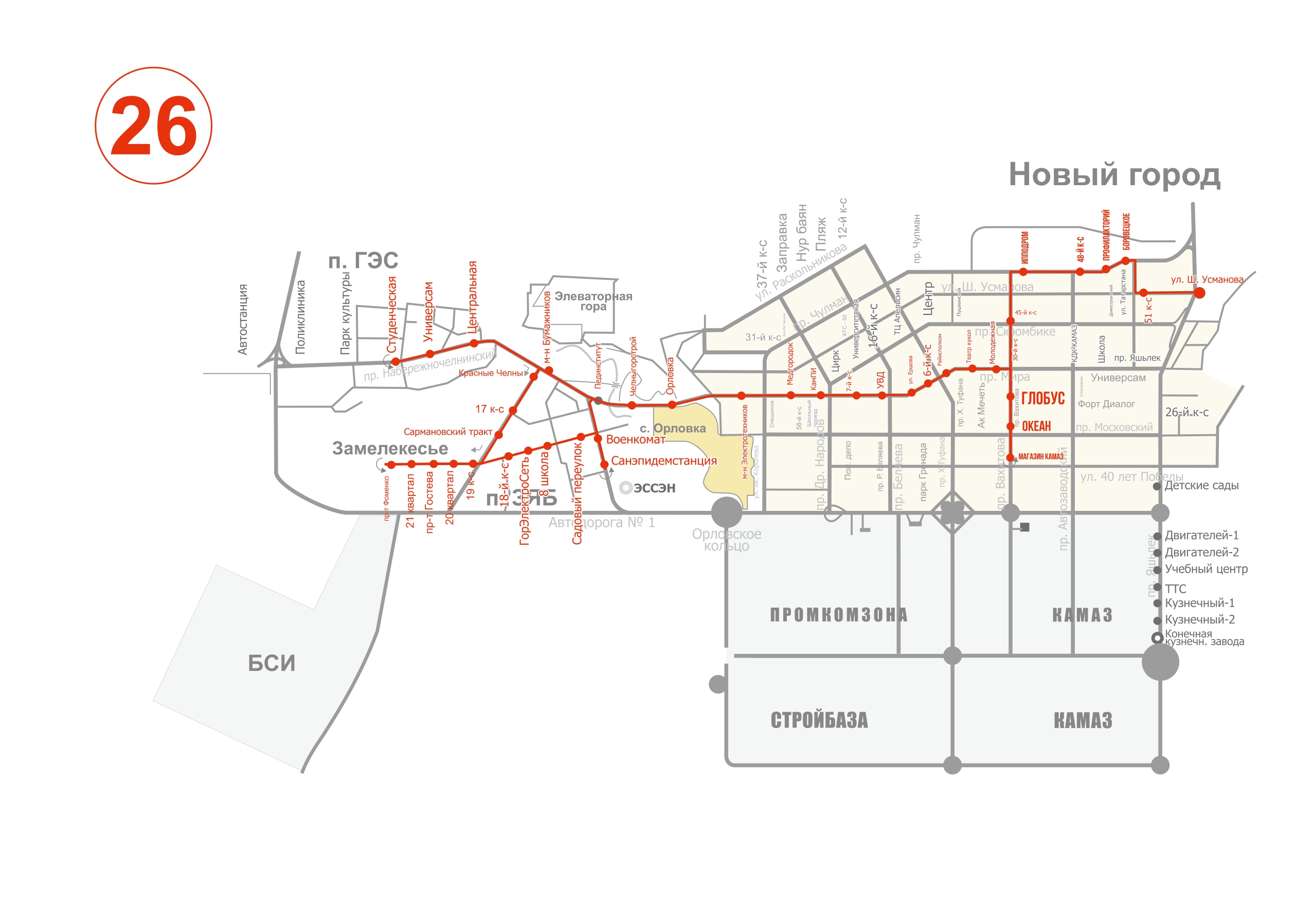 Движение автобусов маршрута №26 с пос. ГЭС будет осуществляться через остановки «Студенческая», «Универсам», «Центральная», далее автобус продолжает движение по Сармановскому тракту, через остановки «Красные Челны», «17 комплекс», с выездом на проспект Фоменко. Далее без изменений по маршруту.