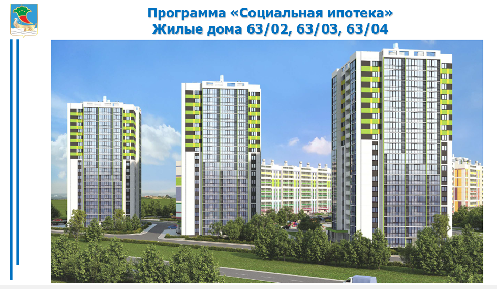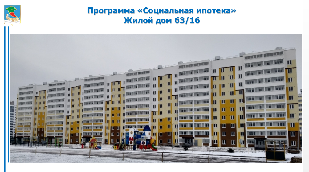 Построенные по программе «Социальная ипотека» два дома 63/20 63/21позволили улучшить жилищные условия 823 семьям работникам бюджетной сферы, молодым семьям, а также работникам предприятий, инвестирующих в строительство. При этом очередность по программе «Социальная ипотека» сегодня составляет 954 семьи