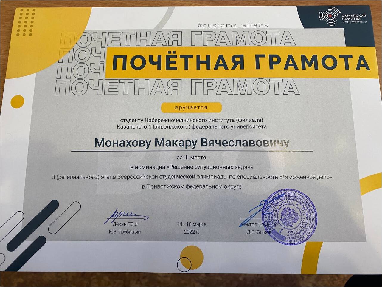 Накануне в Самаре подвели итоги II этапа Всероссийской студенческой олимпиады по специальности "таможенное дело" в Приволжском Федеральном округе. В номинации "Решение ситуационных задач" III место занял студент 5 курса Набережночелнинского института КФУ Монахов Макар. Он и остальные призеры олимпиады были награждены почетными грамотами от президента ТПП Валерия Фомичева.