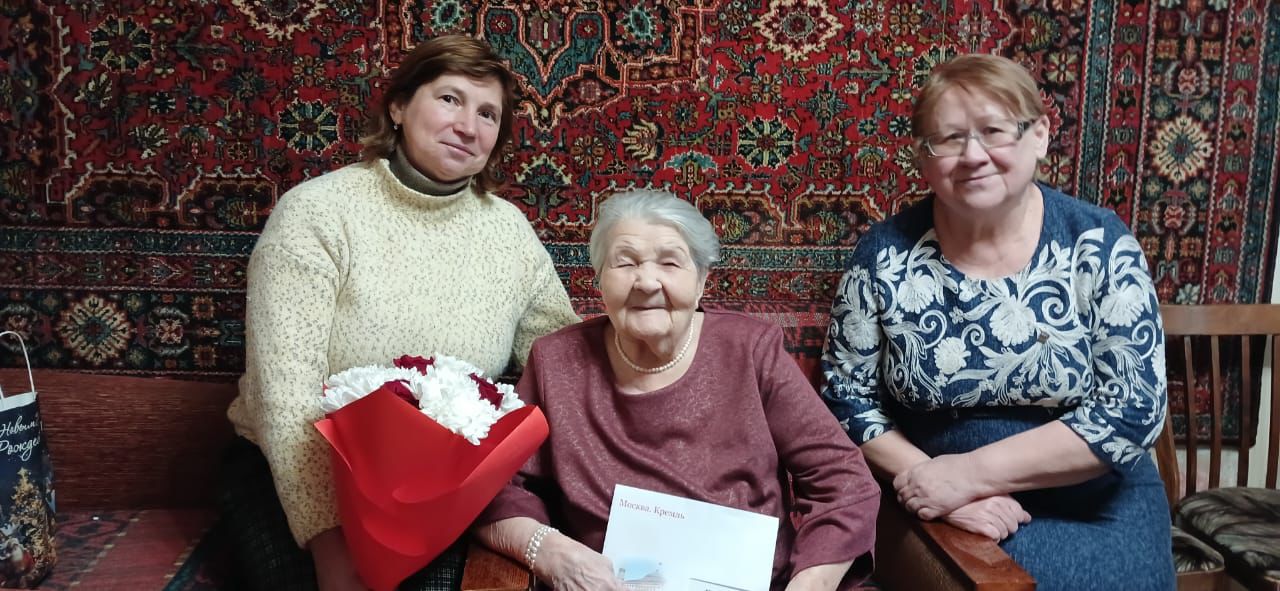 От имени Президента Российской Федерации Владимира Путина и мэра города Наиля Магдеева юбиляра поздравили заместитель главы администрации Автозаводского района Елена Альмухаметова и председатель территориального общественного самоуправления «Надежда» Венера Наумкина.