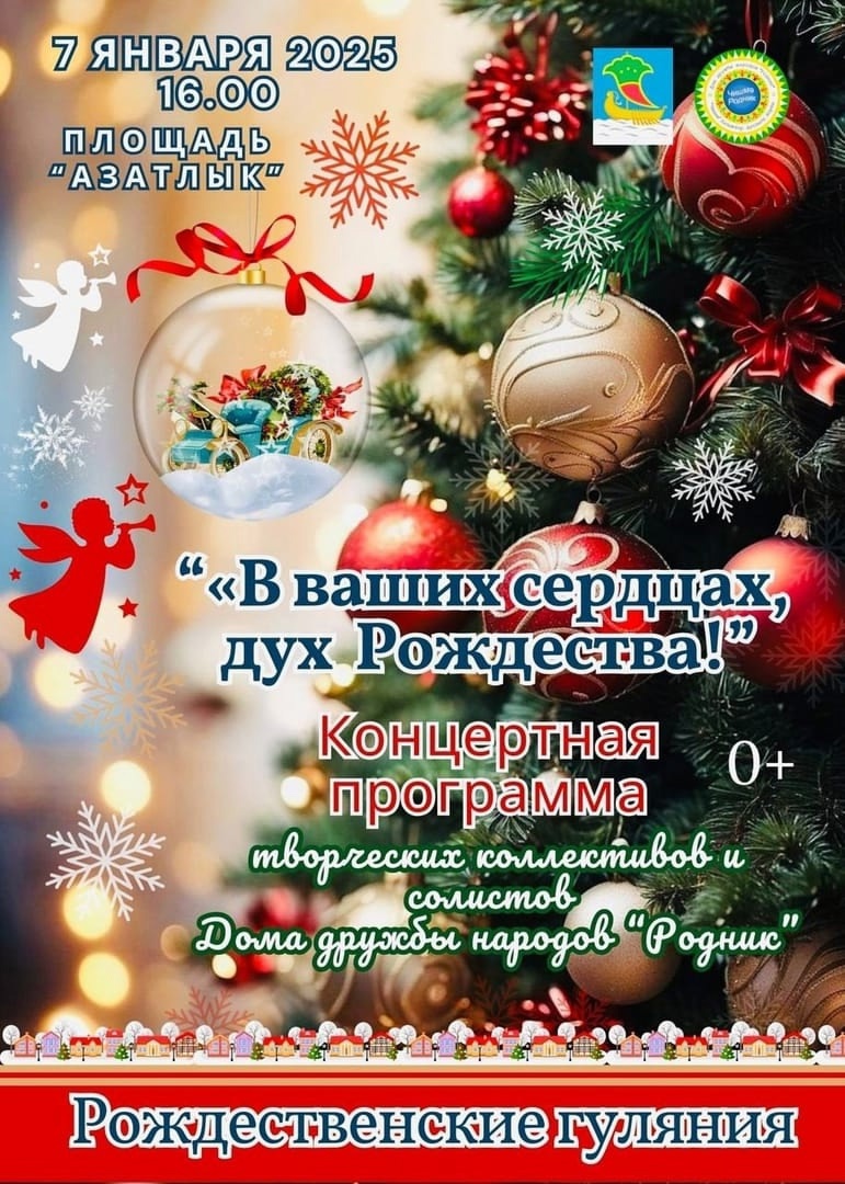 7 января в 15 и 16 часов развернутся рождественские гуляния на площади Азатлык и на площади дворца культуры «Энергетик». Концертную программу «В ваших сердцах, дух Рождества!» подарят творческие коллективы и и солисты Дома дружбы народов «Родник».