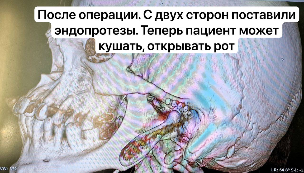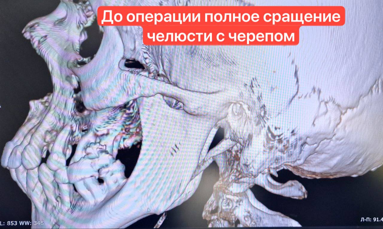 «С такими тяжёлыми последствиями травм я ранее не встречался. Только проведя клинический осмотр, убедился, что челюсть пациента действительно обездвижена, и он не может открыть рот, - рассказал Баин Дёмкин. – После компьютерной томографии мы смогли поставить точный диагноз «Полный анкилоз височно-нижнечелюстных суставов с двух сторон». Травма привела к тотальной дисфункции нижней челюсти, и она, закостенев, срослась с височной костью черепа. Суставы полностью отсутствовали с двух сторон».