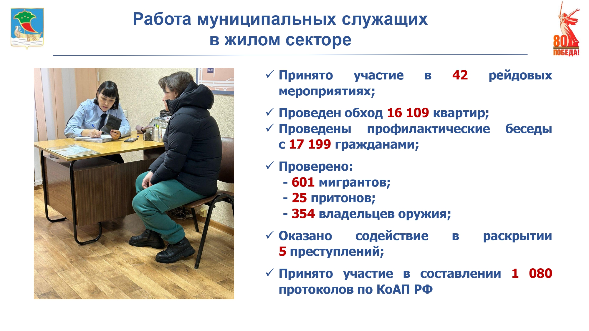 В 2024 году специалисты по профилактике правонарушений в жилом секторе совместно с участковыми уполномоченными полиции приняли участие в 42 рейдовых мероприятиях, провели обход 16 109 квартир, осуществили 446 проверок граждан, состоящих на учете и представляющих опасность для окружающих. Осуществлено содействие в раскрытии пяти преступлений, принято участие в составлении 1 080 протоколов КоАП РФ.