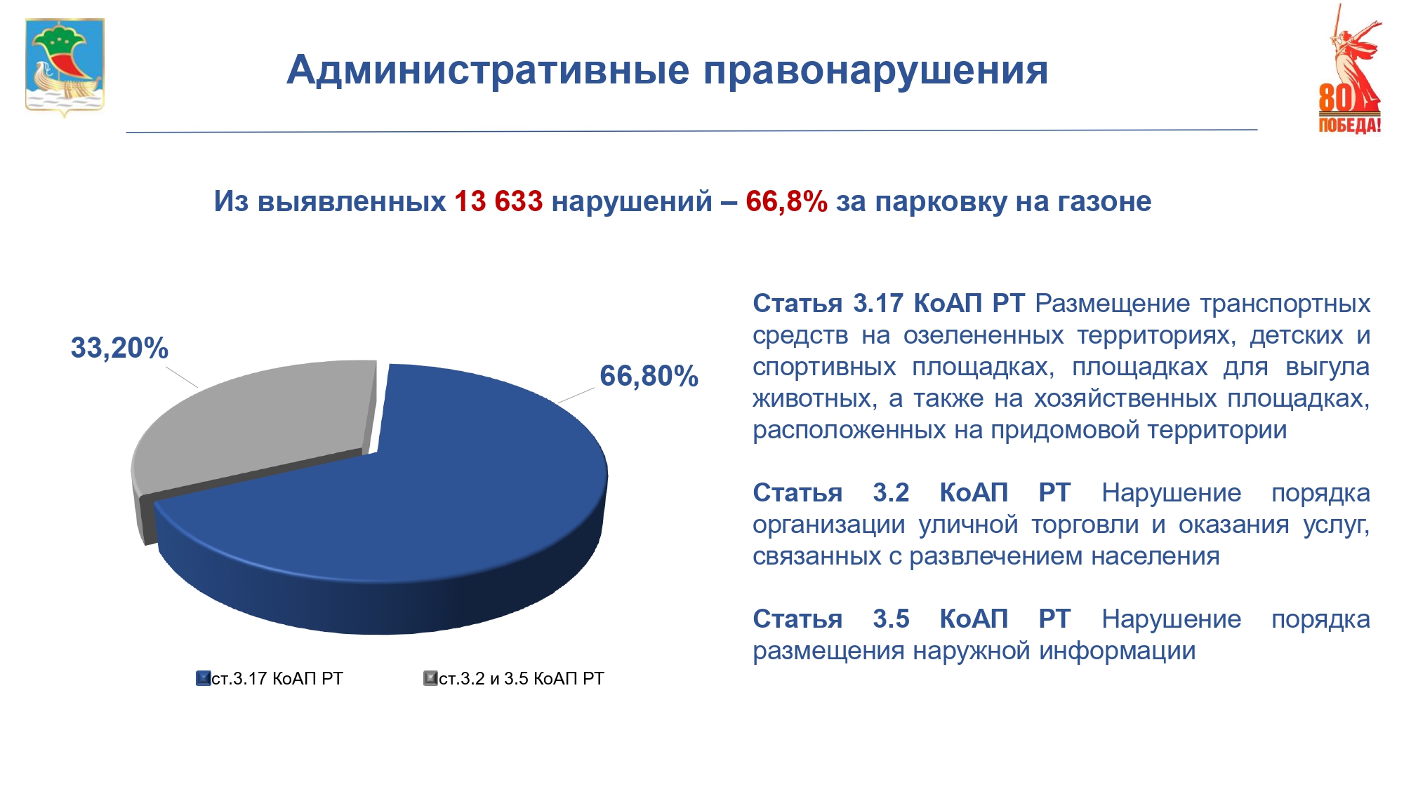 За 2024 год управлением выявлено 13 633 правонарушений, из них – 66,8% по ст. 3.17 КоАП РТ и 33,2%, то есть 4 519 протоколов, составлено сотрудниками по статьям 3.2 и 3.5 КоАП РТ.