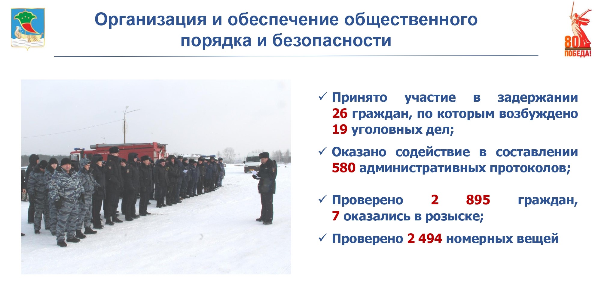 Ежедневно специалисты по организации и обеспечению общественного порядка и безопасности совместно с патрульно-постовой службой полиции охраняют общественный порядок и безопасность граждан, одними из первых оказываются на месте происшествия, принимают меры для задержания нарушителей. За отчетный период принято участие в задержании по подозрению в совершении преступления 26 граждан, по которым возбуждено 19 уголовных дел. Оказано содействие в составлении 580 административных протоколов по КоАП РФ. Осуществлены проверки граждан, в результате которых из 2 895 проверенных лиц семь находились в розыске.