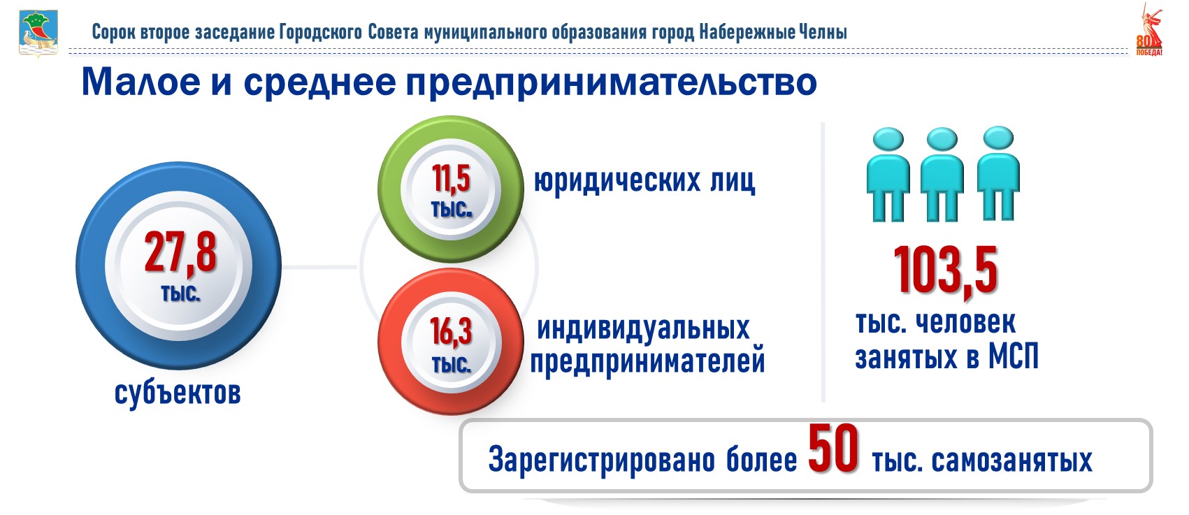 В Набережных Челнах количество субъектов малого и среднего предпринимательства (МСП) ежегодно растёт, сегодня их около 28 тысяч. Оборот за год вырос на 8%. На территории промышленных парков осуществляют деятельность 356 резидентов. Численность работников в парках выросла на 9% и составляет 20 985 сотрудников.