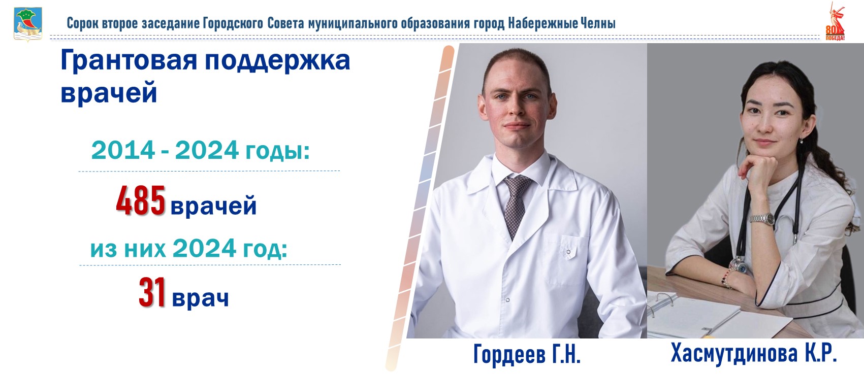 Укомплектованность врачебными кадрами имеет положительную динамику – 61,8%, средними медицинскими работниками – 76,9%. Серьезную помощь в решении кадрового вопроса оказывает грантовая поддержка Правительства Республики Татарстан. За последние годы благодаря ей в город приехало 485 врачей, 31 из них в 2024 году.
