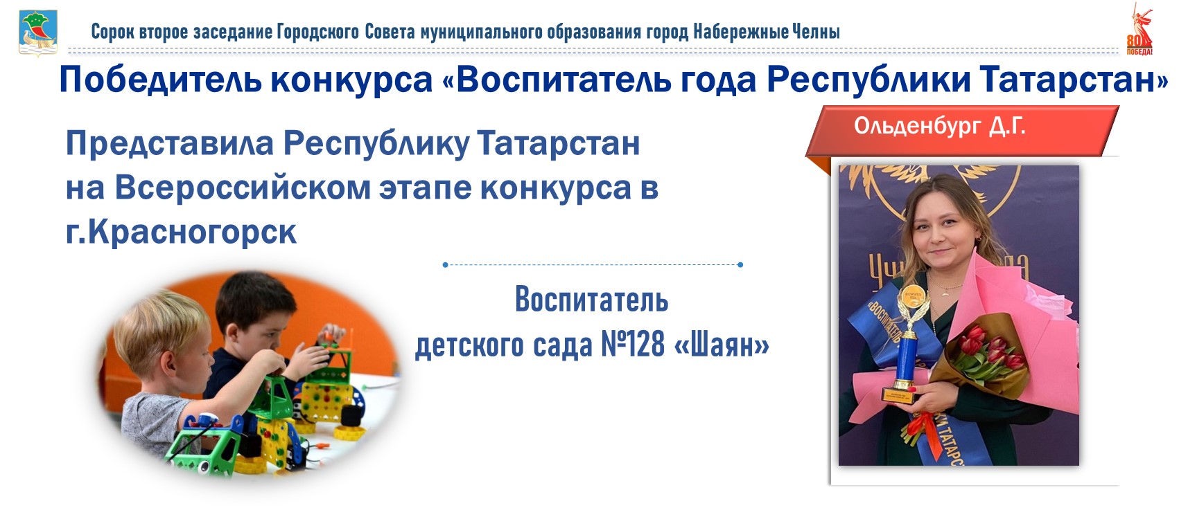 Управление образования особо отмечают воспитателя детского садика №128 «Шаян» Дарью Геннадьевну Ольденбург, которая представляла Республику Татарстан на Всероссийском этапе конкурса «Воспитатель года».