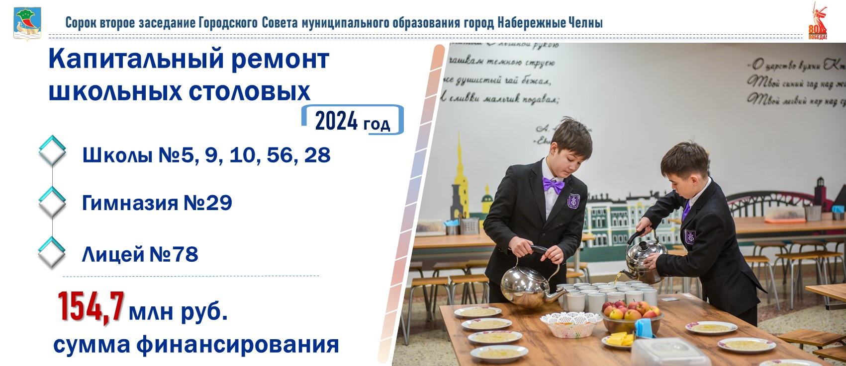 В 2024 году проведен ремонт пищеблоков семи школ: №№5, 9, 10, 56, 28, гимназии №29 и лицея №78. Ремонт пищеблоков будет продолжен и в этом году. Также ремонтные работы запланированы в школе №88 и гимназии №54. На сегодня капитального ремонта ждут 15 школ и 59 детских садов.