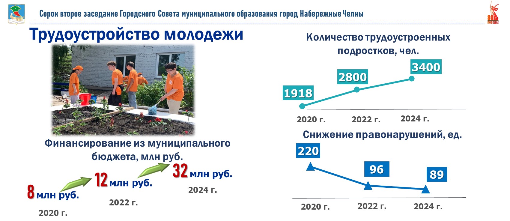 Яшьләр сәясәте өлкәсендә 2024 елга нәтиҗәләр Шәһәр Советыутырышында яңгырады.Яшүсмерләрне эшкә урнаштыру мәсьәләсенә дә җитди игътибар бирелә. Узган ел җәйге каникул чорында 3 400 бала эшкә урнаштырылды.