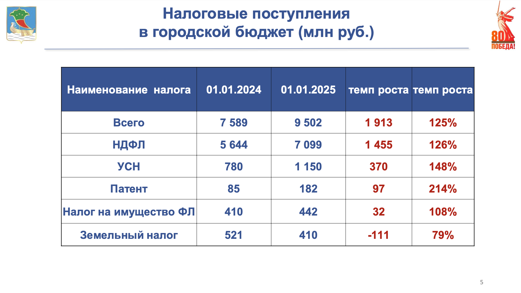 Также в бюджет города включается налог, взимаемый в связи с применением патентной системы налогообложения. Он составил 182 млн рублей, зафиксирован рост на 114% или на 97 млн рублей. На восемь процентов увеличились выплаты за налог на имущество физических лиц – это 442 млн рублей. Поступление земельного налога составило 410 млн рублей с уменьшением на 21% или на 111 млн рублей.