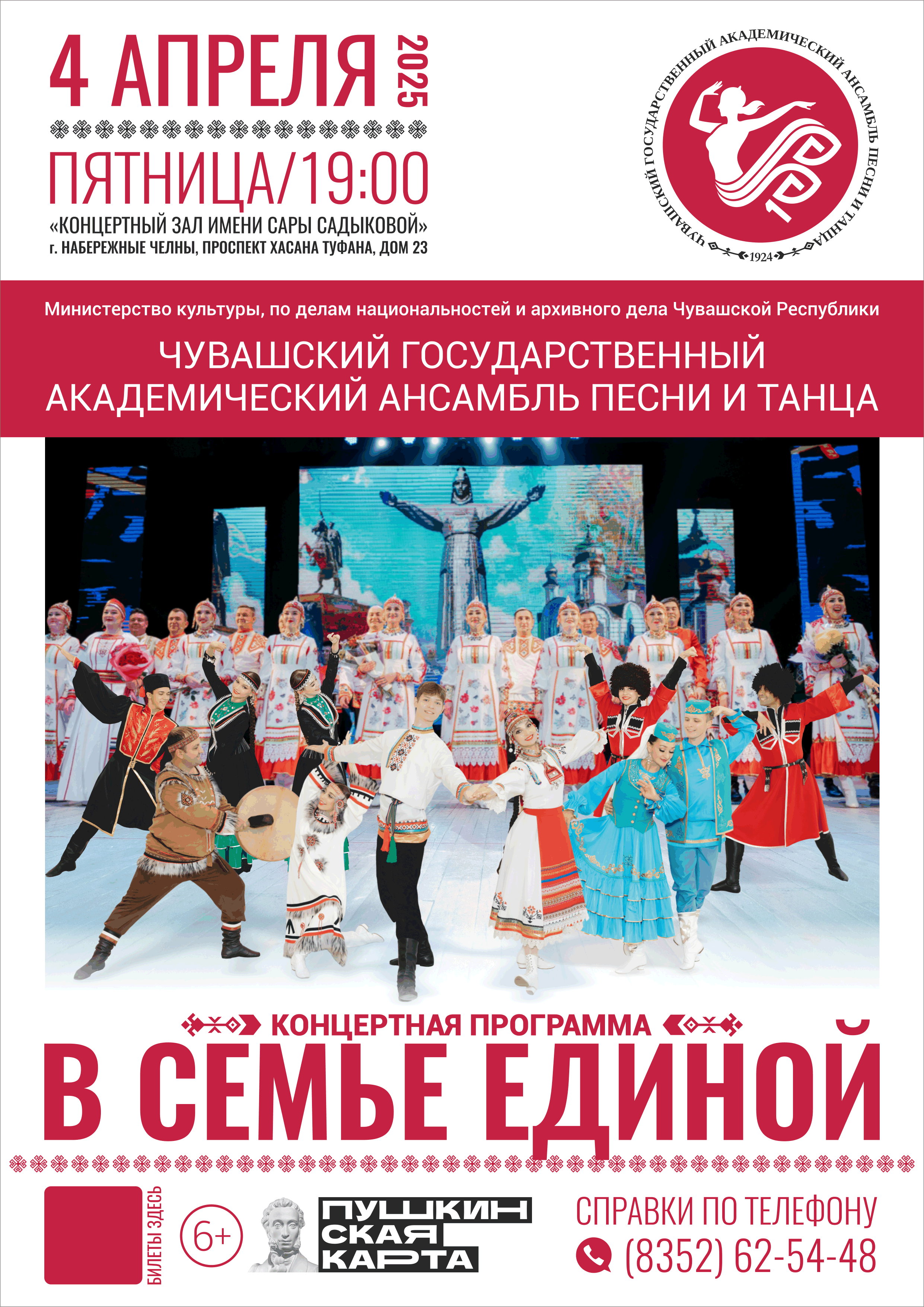 4 апреля в Концертном зале имени Сары Садыковой выступит Чувашский государственный академический ансамбль песни и танца с концертной программой «В семье единой». Начало в 19:00.