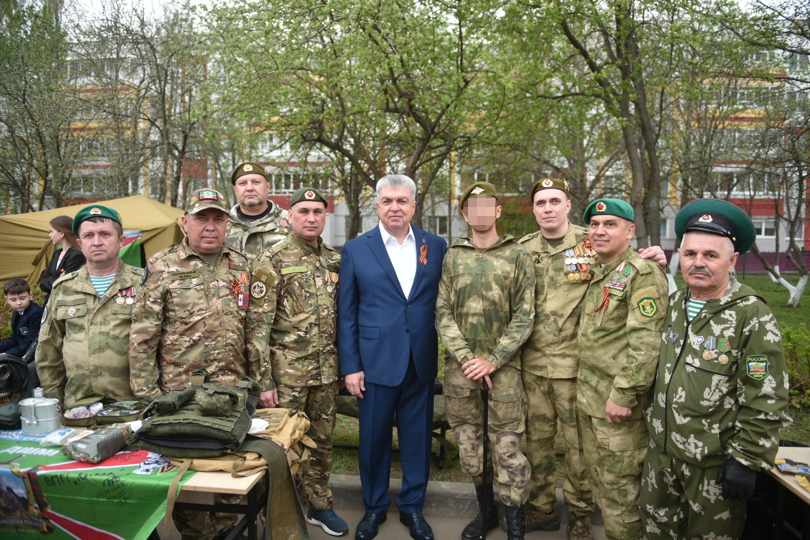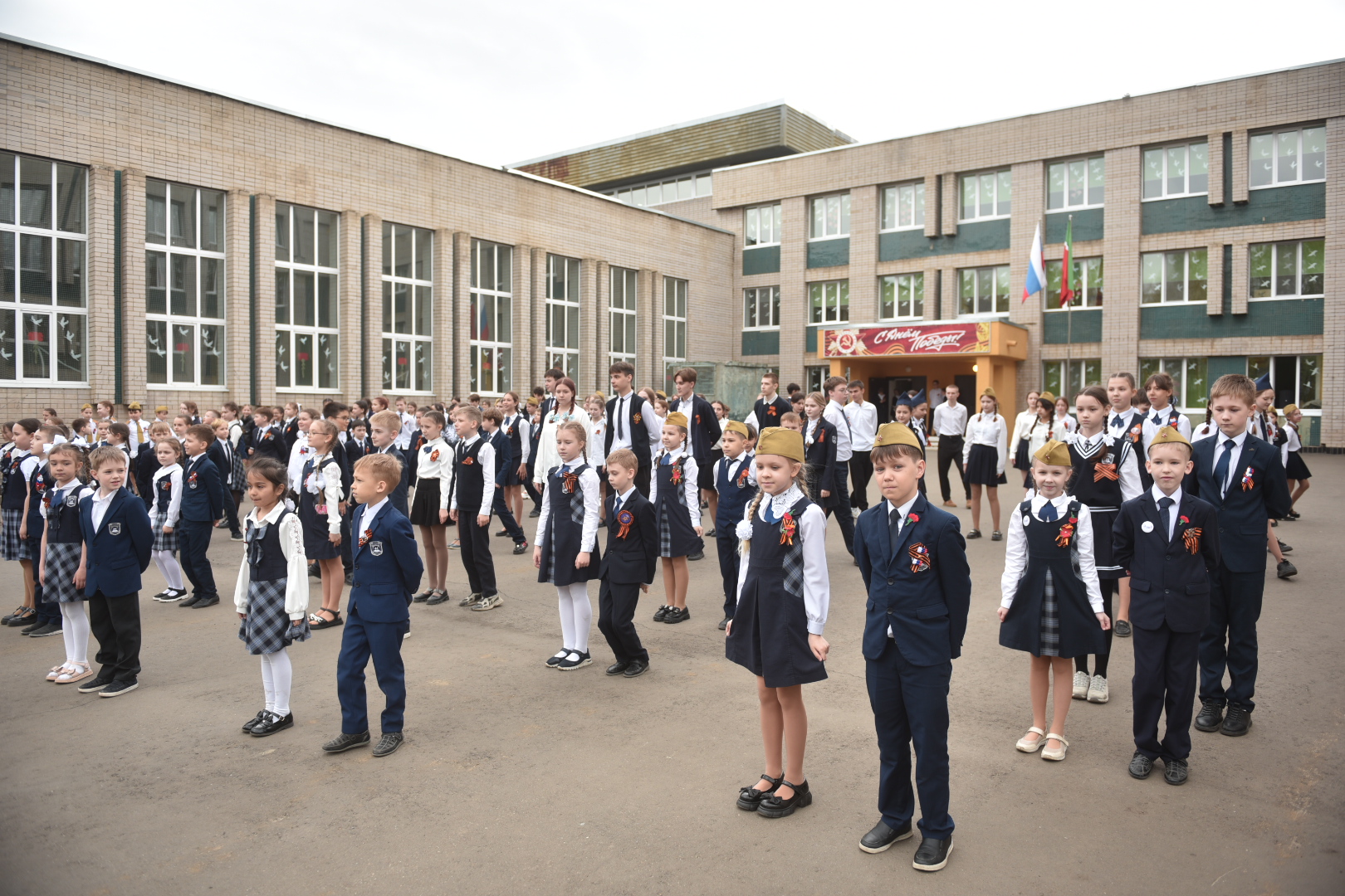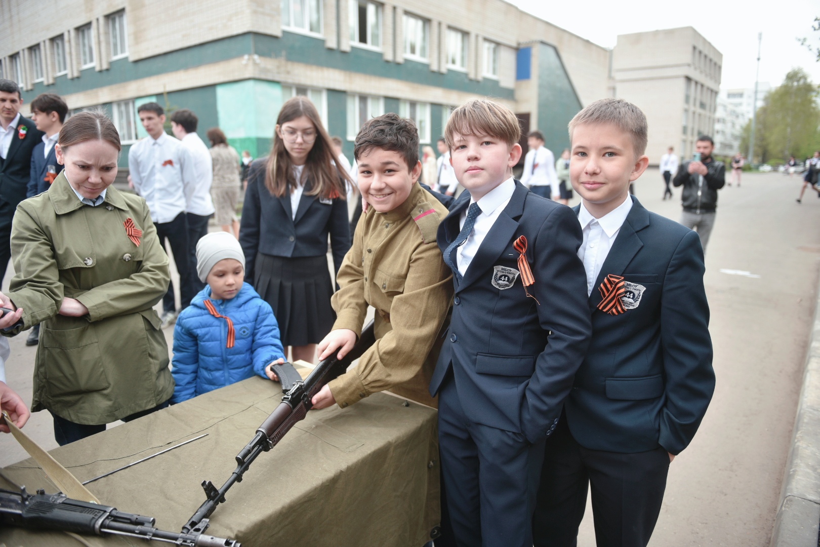 У главного входа в школу расположилась выставка, организованная совместно с участниками специальной военной операции. На столах лежало вооружение и снаряжение современной российской армии: пулеметы, снайперские и автоматические винтовки, гранатометы, бронежилеты и сумки с медикаментами. Выставку организовали волонтеры из ДШМГ «Барс», чьи участники объясняли информацию детям. Рядом установили полевую кухню, в которой готовили легендарную солдатскую кашу.
