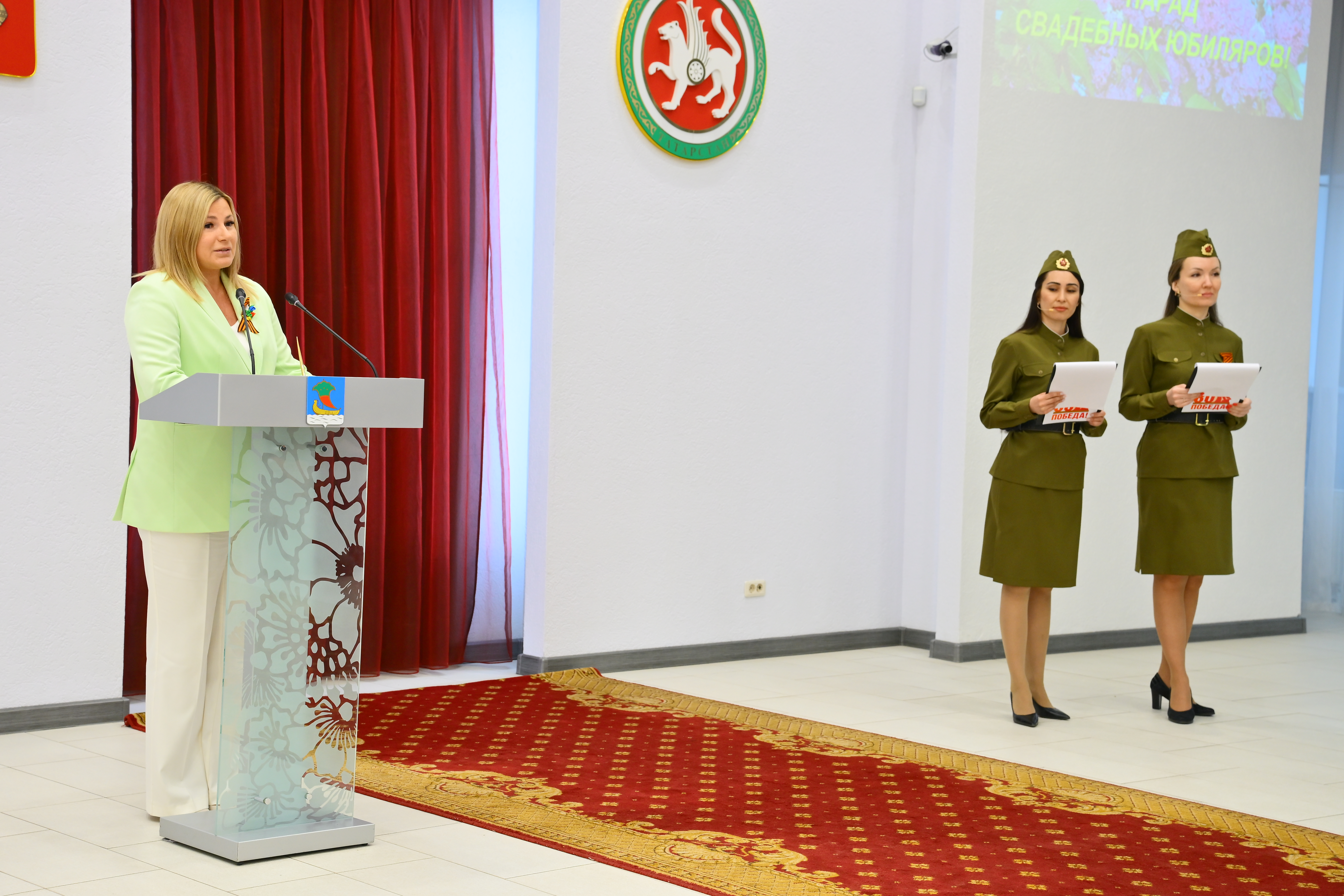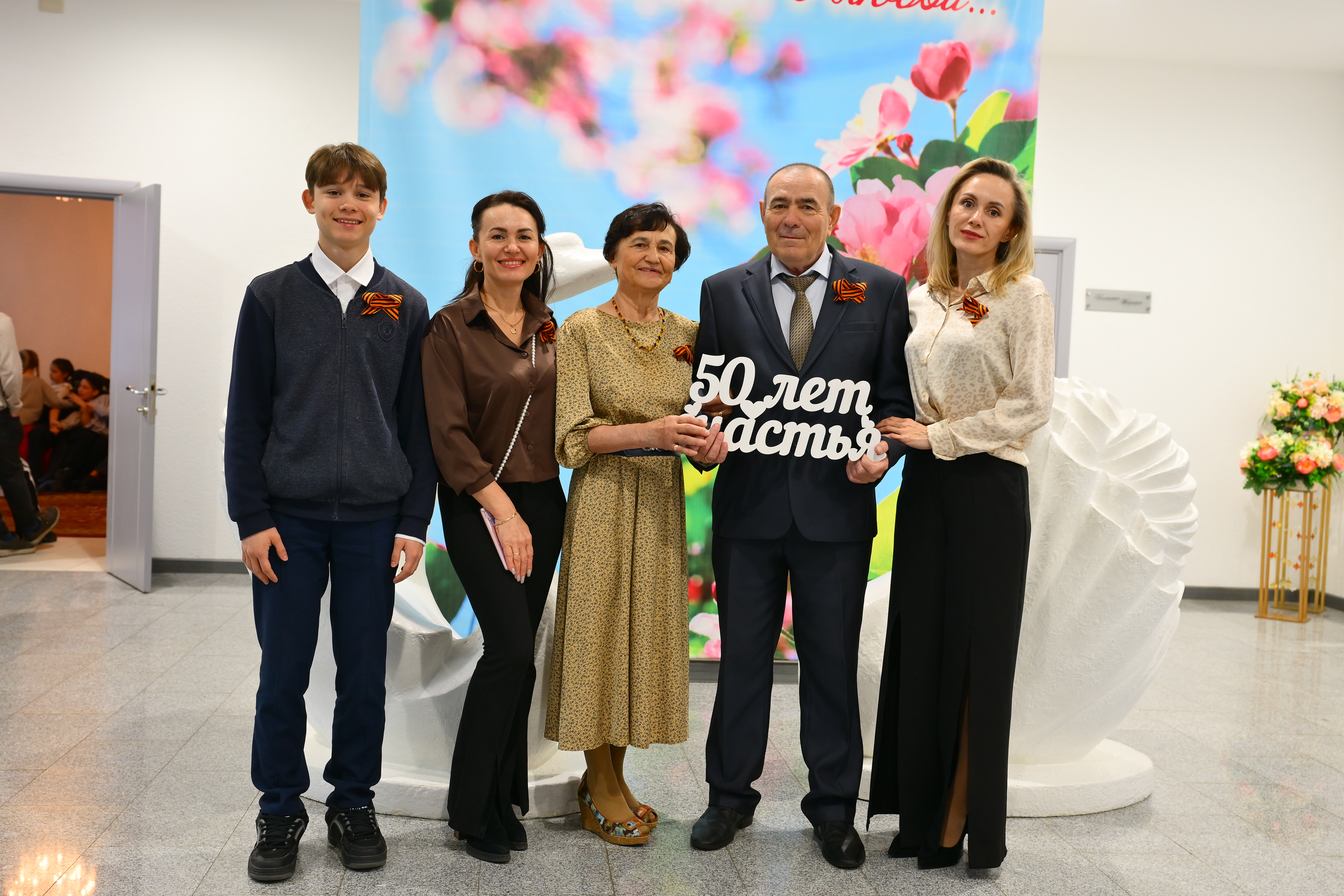 Чествование юбиляров семейной жизни сопровождалось яркой концертной программой. В завершении праздника юбиляры и специалисты Управления ЗАГС возложили цветы к мемориалу «Родина-мать».