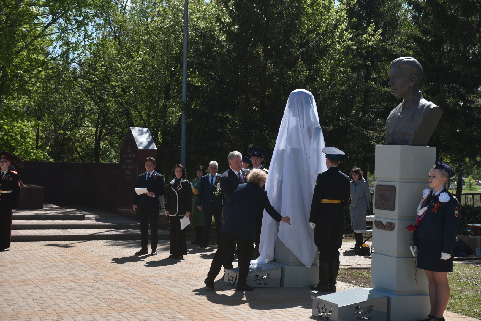 Полотно с бюста сняли мэр города Наиль Магдеев и мама Героя России Ольга Чебнева. Вместе они первыми возложили цветы.