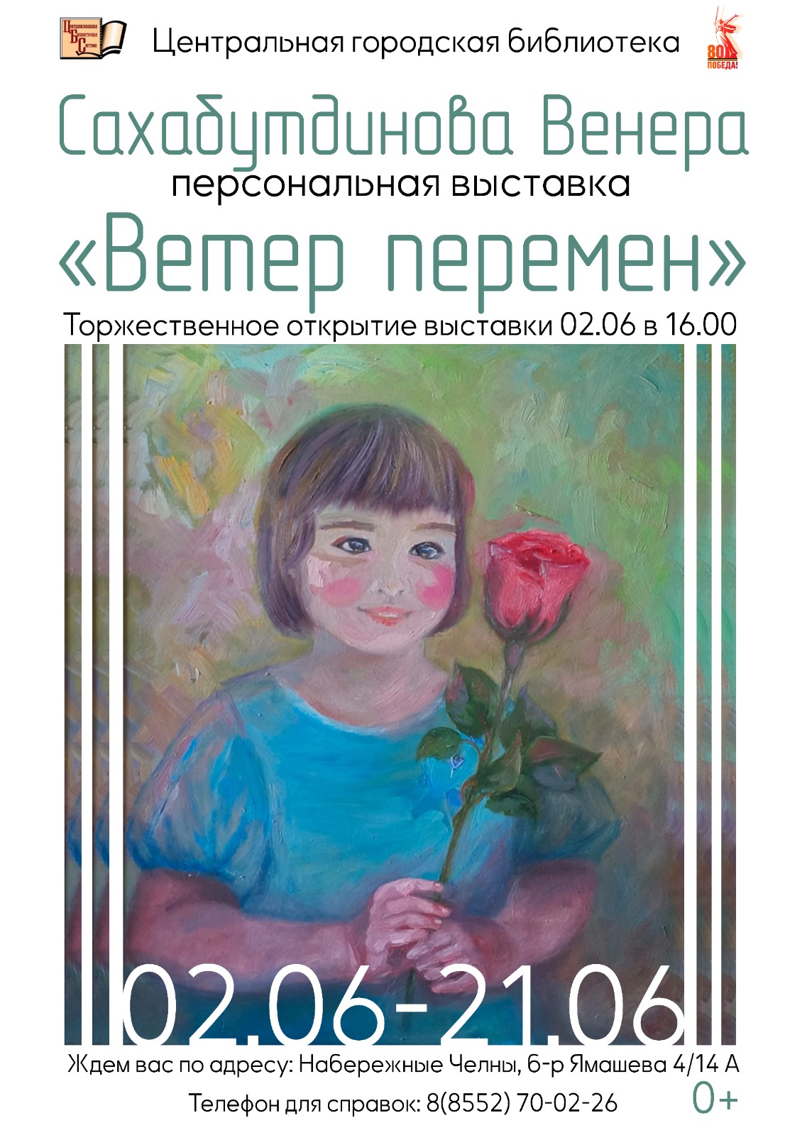 2 июнь көнне Үзәк шәһәр китапханәсендә Венера Сәхабетдинованың шәхси күргәзмәсе ачылачак. Ачылу тантанасы 16:00 сәгатьтә башлана.