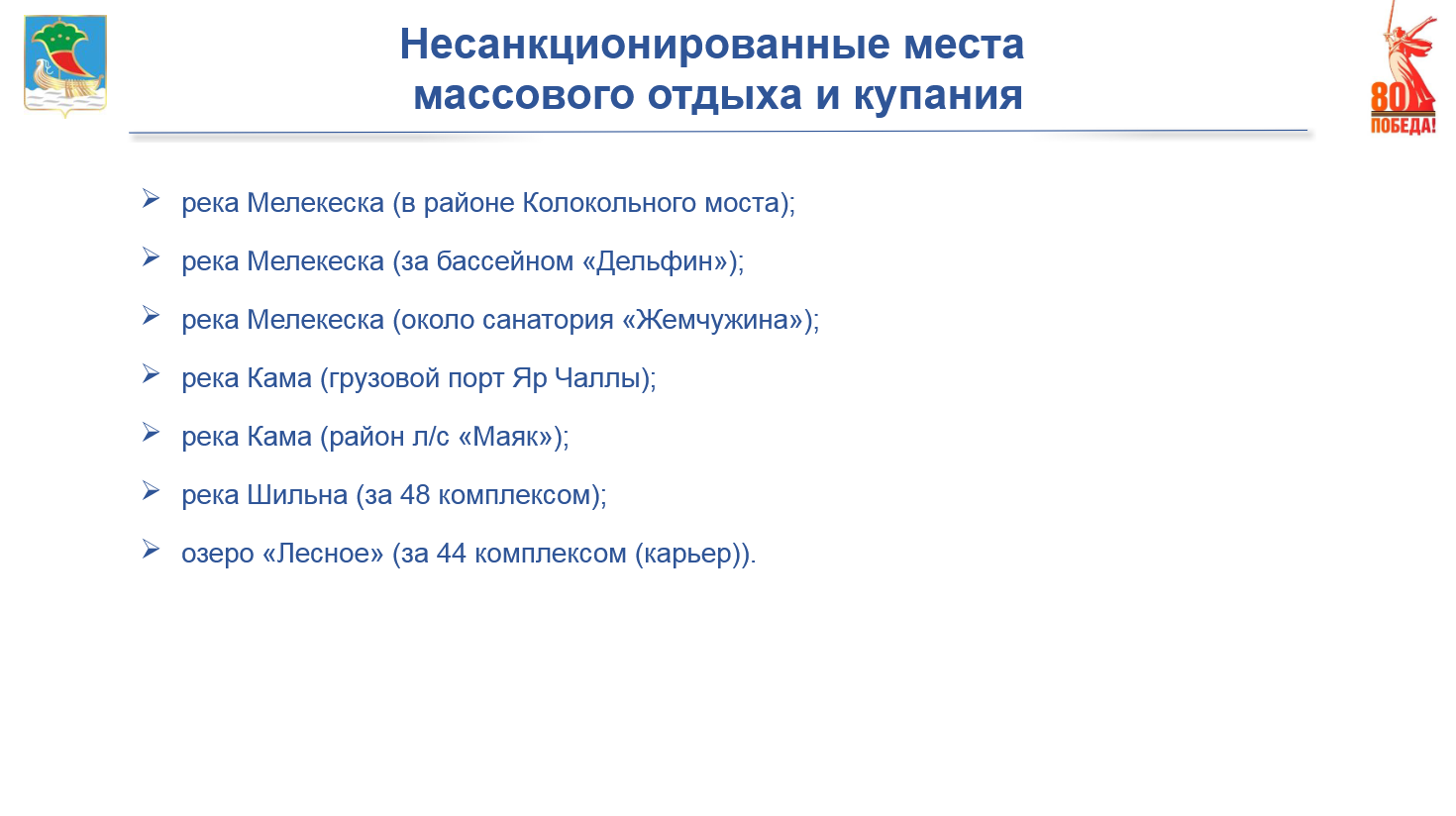 Особое внимание уделяется контролю за несанкционированными местами купания. На территории города выявлено семь таких зон, которые представляют повышенную опасность для жизни и здоровья горожан. В целях предупреждения несчастных случаев принято решение о комплексных мерах по контролю за этими участками.