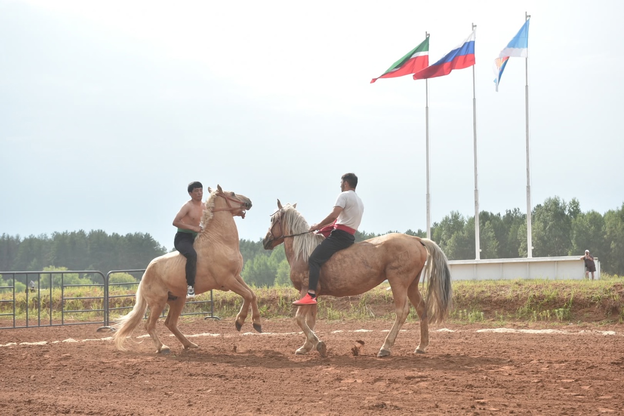 На майдане парка Прибрежный проходили схватки по национальной борьбе корэш. Поединки временно прервались из-за внезапной грозы, но после состязания продолжились. За титул абсолютного батыра боролись более 200 спортсменов в весовых категориях до 135 кг. Титул достался Азату Габдрашитову.