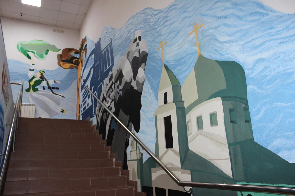 На стенах двух лестничных пролетов теперь красуются панно, изображающие и историю города, и исторические события нашей страны: здесь и легендарный «КамАЗ», и кинотеатры «Чулпан» и «Батыр», и мемориальный комплекс «Родина-мать». Изображения на военную тематику нашли свое отражение в зале «Славы». При разработке эскизов использовали различные источники, рассказал студент Аяз Бадамшин: «Нас всего 20 человек в группе и фронт работ мы разделили. Лично наша была ответственно за стену военно-патриотического направления. Мы использовали нейросеть, осматривали ордена, медали, фотографии. Всё это вкупе помогло нам определиться с тем, что мы будет изображать. В итоге портрет Сталина выделяется особо и портрет участника СВО».