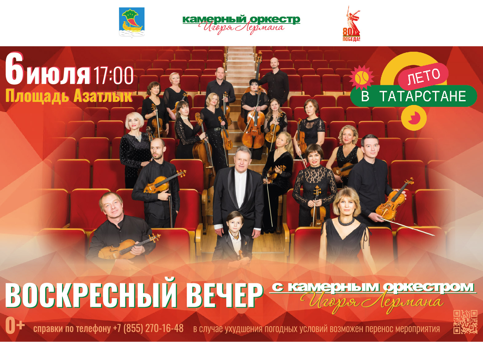 6 июля в 17:00 в рамках республиканского проекта «Лето в Татарстане» на площади Азатлык под открытым небом состоится концерт «Воскресный вечер с Камерным оркестром Игоря Лермана».