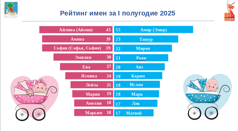 Чаллыда иң популяр исемнәр – Айлина (Айлин) һәм Әмир булды. Бу хакта ЗАГС җитәкчесе Равилә Зарипова хәбәр итте.