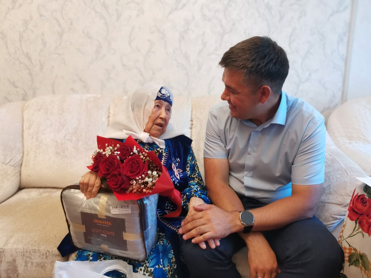 95 яшьлек юбилее белән котлауларны Бөек Ватан сугышы ветераны, тыл хезмәтчәне Минсәймә Мирзагасманова кабул итә.