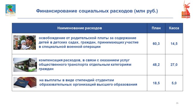 Профинансировано было освобождение от родительской платы за содержание детей в детских садах, граждан, принимающих участие в специальной военной операции на 14,5 млн рублей. Компенсация расходов в связи с оказанием услуг общественного транспорта льготной категории граждан составила 27 млн рублей. Выплачены стипендии студентам-целевикам образовательных организаций высшего образования на 5 млн рублей.