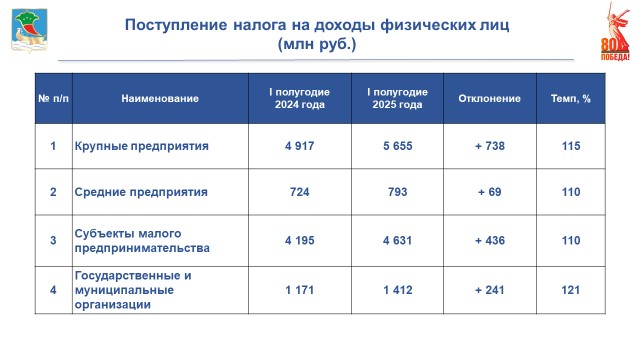 В консолидированный бюджет рост поступлений налога на доходы физических лиц составил 1 млрд 484 млн рублей, в том числе по: крупным предприятиям на 738 млн рублей, средним на 69 млн рублей, субъектам малого предпринимательства на 436 млн рублей, государственным и муниципальным организациям на 241 млн рублей.