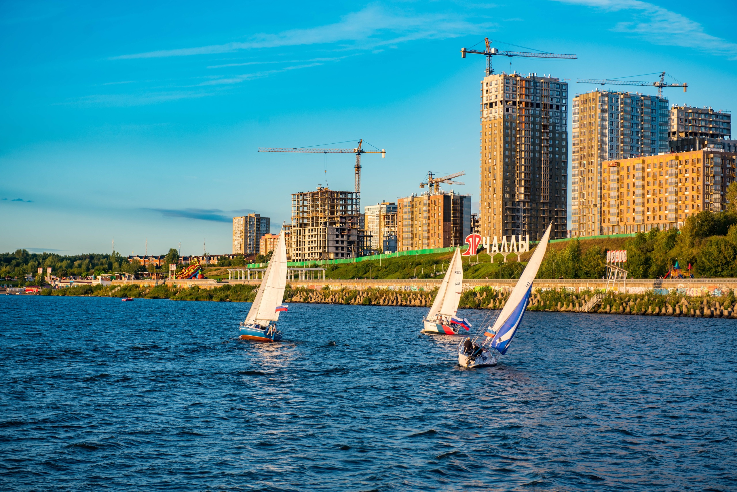 На фоне же неторопливо проплыли парусники, на каждом из которых также был российский триколор.