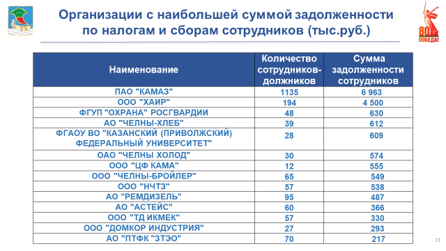 В Набережных Челнах 50 тысяч налогоплательщиков – физических лиц имеют налоговые долги во все уровни бюджетов. При этом сами организации – работодатели ответственно относятся к исполнению налоговых обязательств, уплачивая платежи вовремя и в полном объеме. Начальник ИФНС попросила руководителей предприятий провести соответствующую работу с должниками.