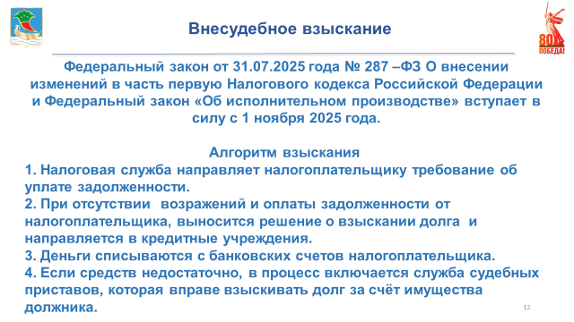 Начальник ИФНС акцентировала внимание на том, что, начиная с 1 ноября 2025 года, налоговая задолженность будет взыскиваться с физических лиц во внесудебном порядке: «Изменение было введено Федеральным законом от 31 июля 2025 года № 287-ФЗ, благодаря которому порядок взыскания средств граждан значительно упрощается и ускоряется. Процедура будет равнозначна взысканию с индивидуальных предпринимателей и юридических лиц. При наличии задолженности и неисполненного требования об уплате налоговые органы будут направлять инкассовые поручения о взыскании задолженности на банковские счета должника».