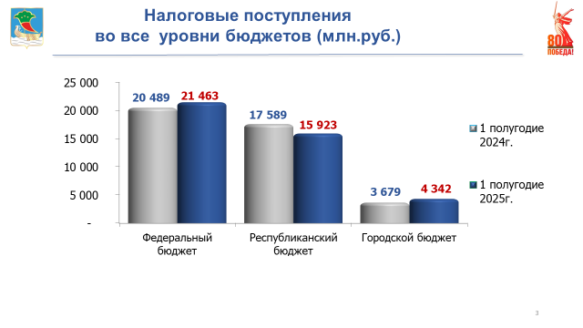 На 1 июля 2025 года в консолидированный бюджет Российской Федерации с территории города зачислено почти 42 млрд рублей, что соответствует уровню аналогичного периода прошлого года, в том числе: в федеральный бюджет поступил 21 млрд рублей, с ростом на 974 млн рублей; в республиканский бюджет мобилизовано 16 млрд рублей, что меньше на 1,7 млрд рублей; в городской бюджет поступило 4,3 млрд рублей, что больше на 663 миллионов рублей.