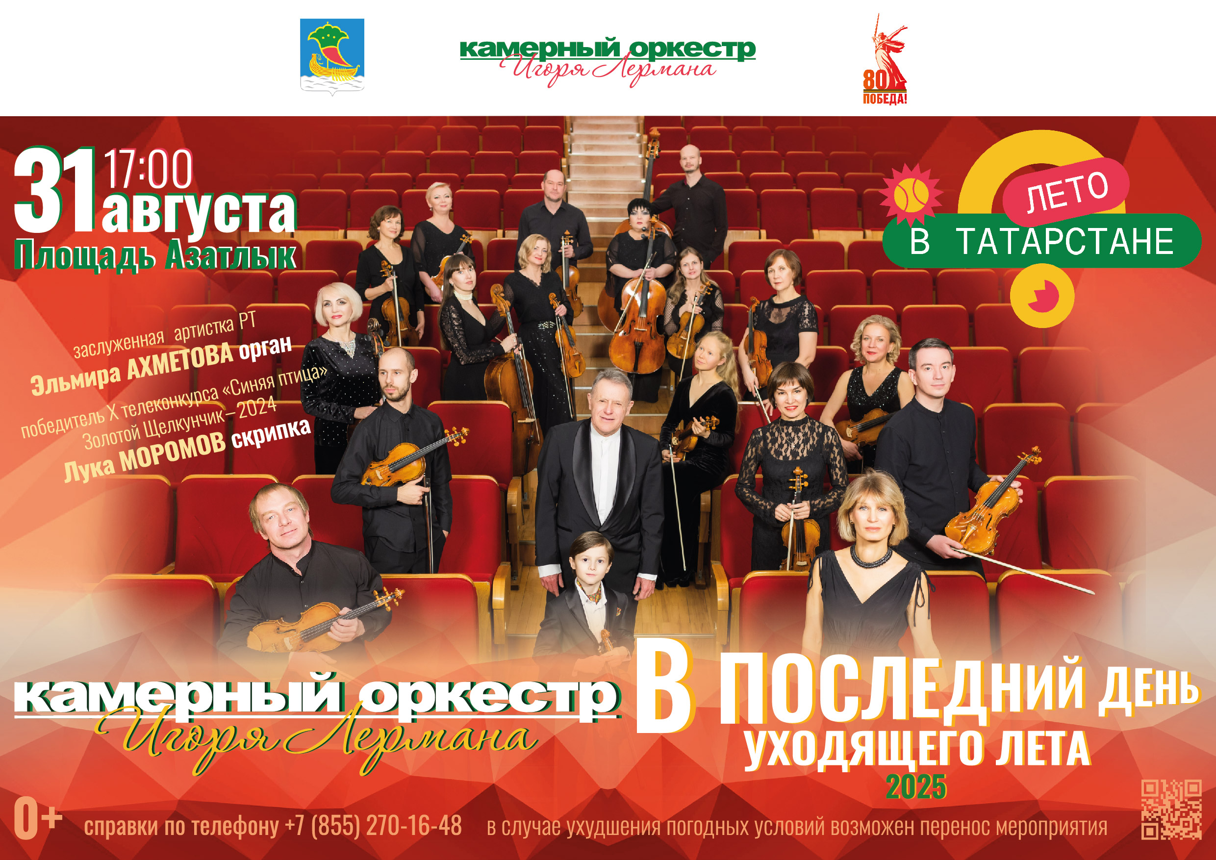 31 августа на площади Азатлык под открытым небом выступит Камерный оркестр Игоря Лермана «В последний день уходящего лета». Для челнинцев и гостей города прозвучат лучшие произведения классической музыки. Начало мероприятия в 17:00.