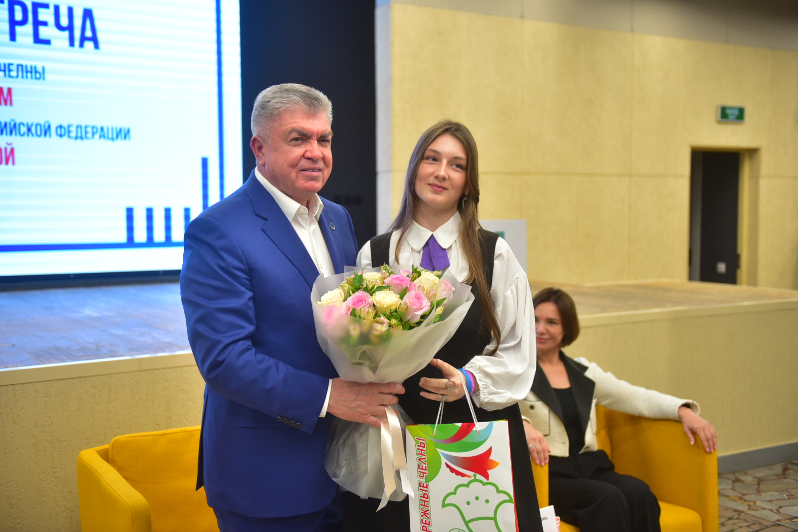 В рамках встречи Наиль Магдеев вручил памятный подарок ученице лицея №78 имени А.С. Пушкина Валерии Гусевой. Одиннадцатиклассница, победитель и призер муниципальных и региональных олимпиад по праву, обществознанию, активный организатор интеллектуальных игр, правовых мероприятий в рамках деятельности отряда по профилактике правонарушений среди несовершеннолетних, стала победительницей заключительного этапа Всероссийской олимпиады по избирательному праву, проходившего в Москве. Её успех стал возможен благодаря высокому уровню подготовки и наставничеству учителя Эльмиры Исхаковны Мухтяровой.