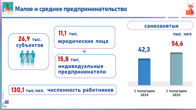 В городе работают 27 тысяч субъектов малого и среднего предпринимательства, что на 1,5% выше соответствующего периода прошлого года. В этой сфере трудятся 130 тыс. человек. За отчетный период 23 человека открыли свой бизнес благодаря государственной поддержке в общей сумме 3,3 млн руб.