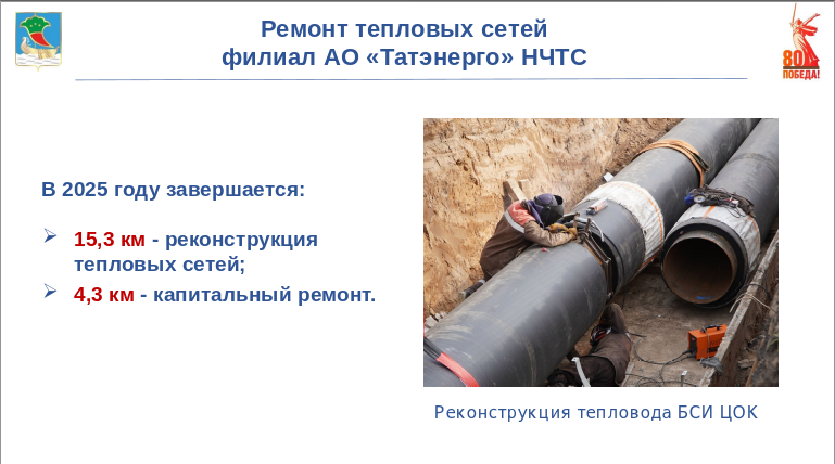 Набережночелнинские тепловые сети в 2025 году завершают реконструкцию тепловых сетей общей протяженностью 19,6 км. Процент выполнения — 87% Работы завершат до 31 октября. Благодаря ежегодно проводимым опрессовкам удалось выявить 177 повреждений.