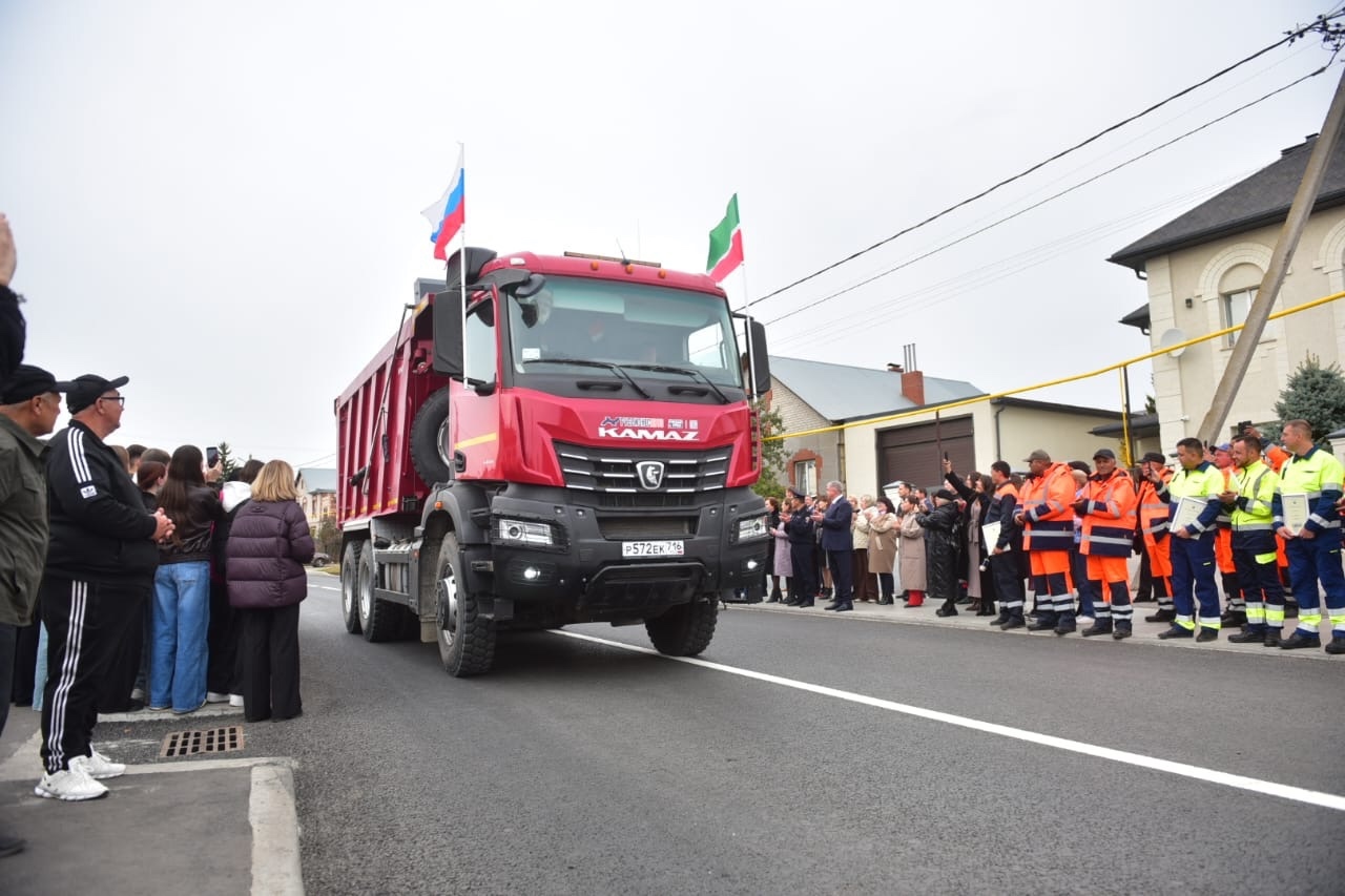 Символический старт началу движения по отремонтированной дороге дали мэр города и Радий Кадиков: после этого, по традиции, по новому асфальту, гудя, проехала колонна самосвалов дорожников.
