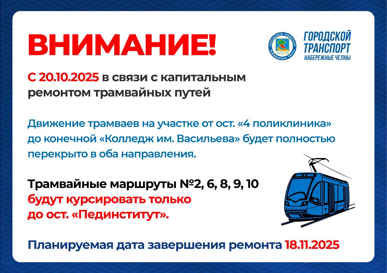 Трамвайные маршруты №№2, 6, 8, 9, 10 будут курсировать только до остановки «Пединститут». Планируемая дата завершения ремонта – 18 ноября.