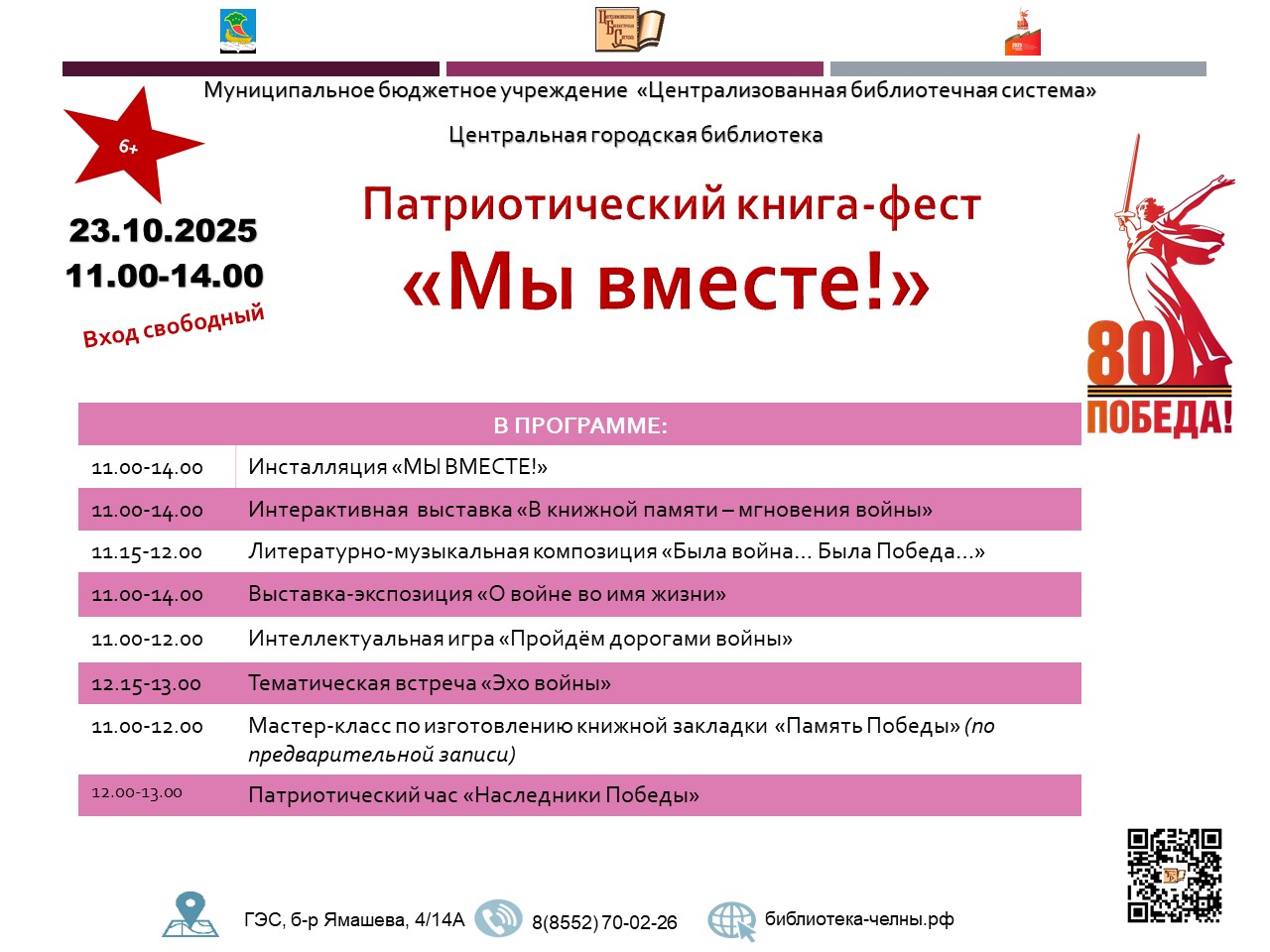 Центральная городская библиотека приглашает челнинцев на патриотический книжный фестиваль «Мы вместе!», приуроченный к году Защитника Отечества и 80-летию Победы в Великой Отечественной войне.