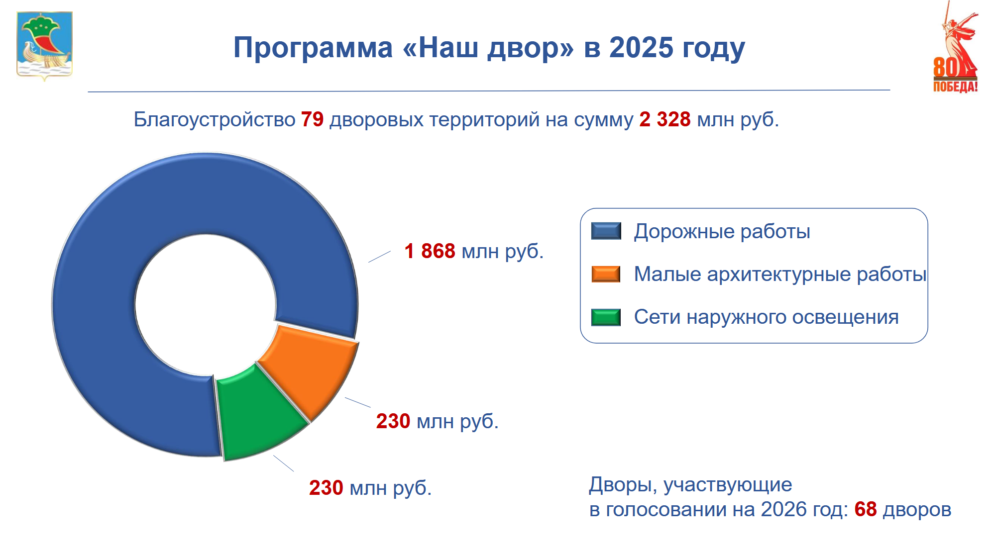 В 2026 году по программе «Наш двор» планируется благоустроить 68 дворовых территорий: в Комсомольском районе — 34 двора, включая комплекса 4А, 14, 19 и территорию «21, 22 — Земекелесье»; в Центральном районе — 30 дворов в кварталах 35, 36, 37, 38 и 60; в Автозаводском районе — четыре двора в микрорайонах 21 и 65.