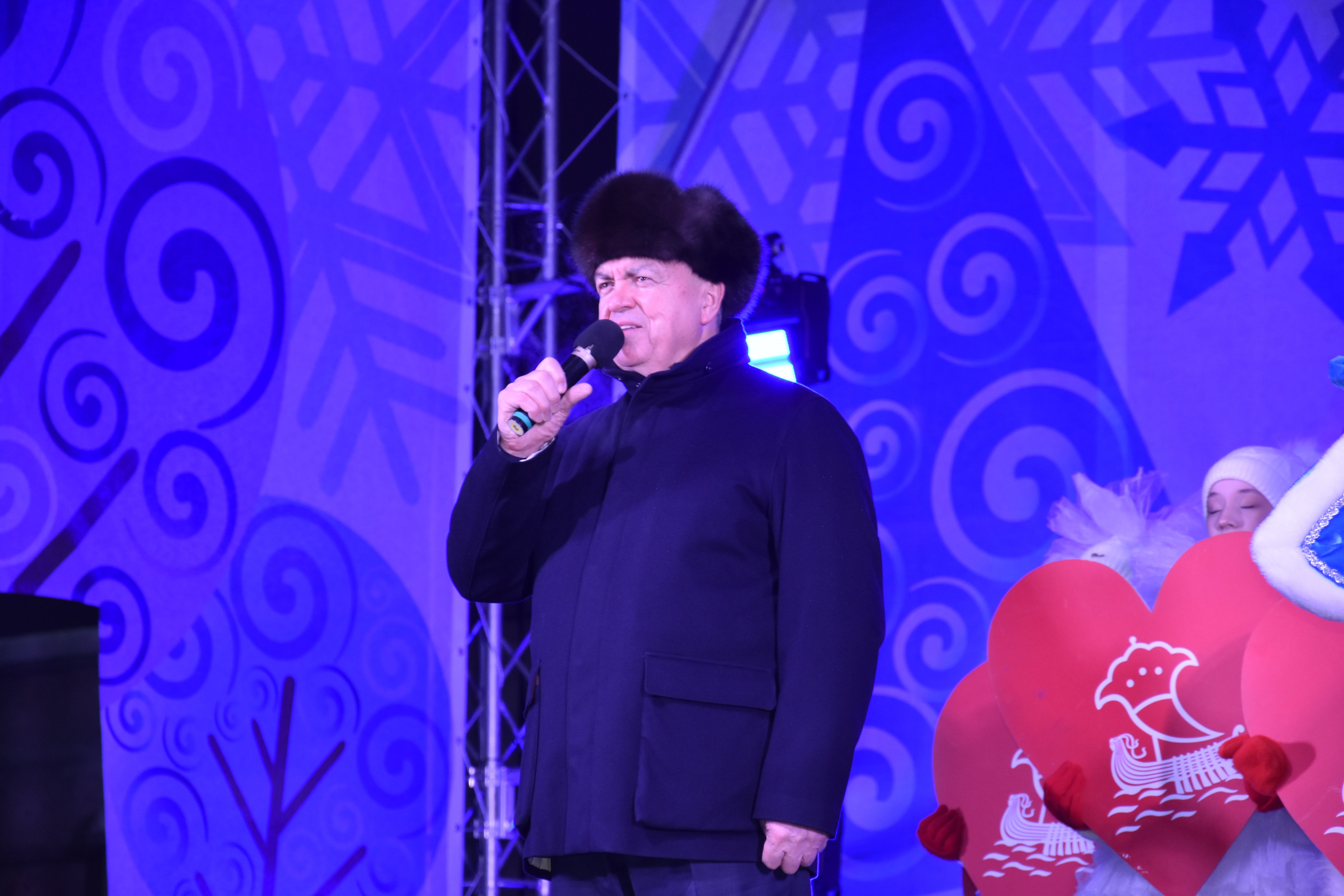 Традиционно, главную елку зажгли Дед Мороз и Снегурочка, которые приехали на автомобиле «КАМАЗ-мастер».